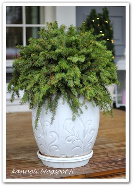Tähtikangasta jäi sen verran sopivasti, että sain muutaman tähden roikkumaan oksankäkkyröihin. Lisäsin vielä valot ruukun juurelle antamaan valoa. Laitoin vähän vanua tähtien sisään ja ompelin ensin reunat kiinni suoralla ompeleella ja viimeistelin reunat siksakilla.